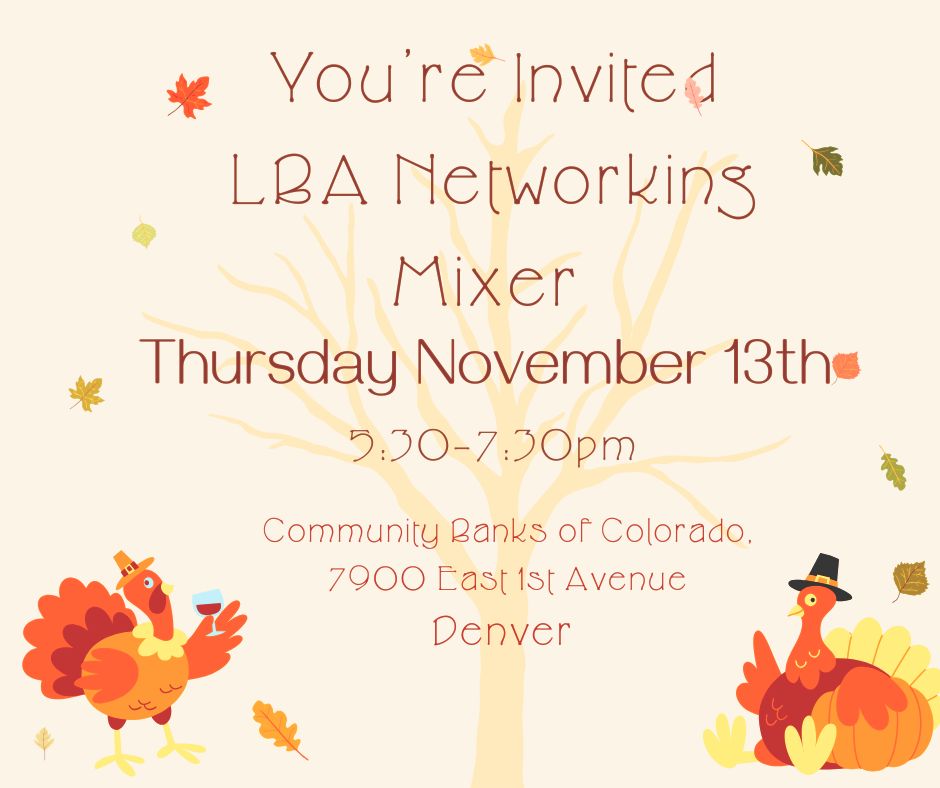 November 13 @ 5:30 pm - 7:30 pm LBA Networking Mixer Community Banks of Colorado 7900 East 1st Ave, Denver, CO